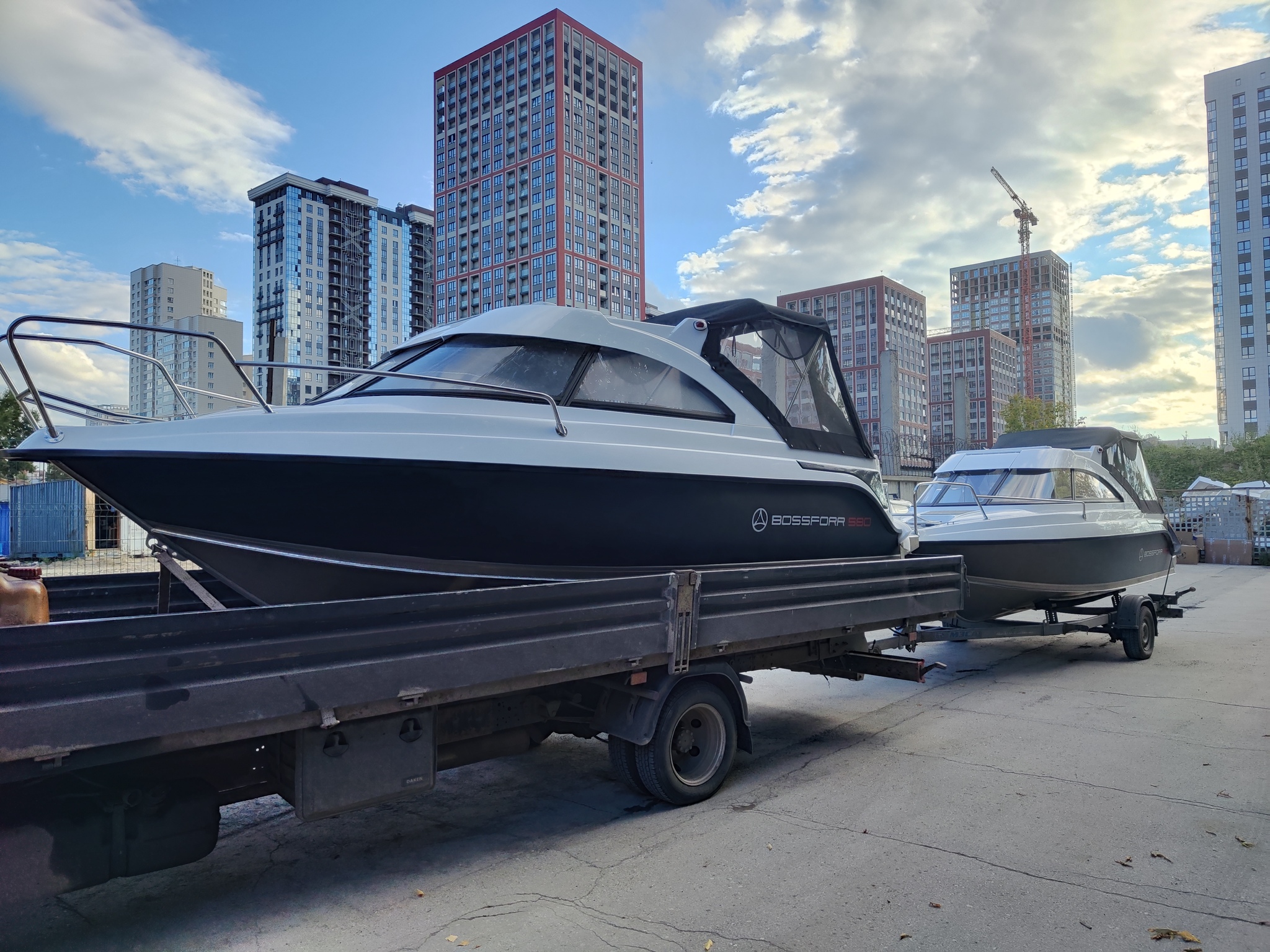 На катере установлено дополнительное оборудование: площадка под датчик эхолота, две транцевые площадки (кринолин), носовые рейлинги с баранами и трапом, газовые доводчики двери выхода на палубу, напольное покрытие EVATIK, салон "Комфорт" (плюс два спальных места), ходовой тент на нержавеющих дугах и транспортировочный чехол.